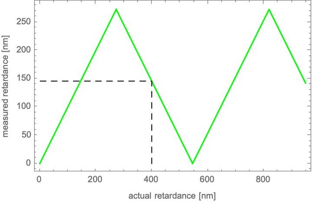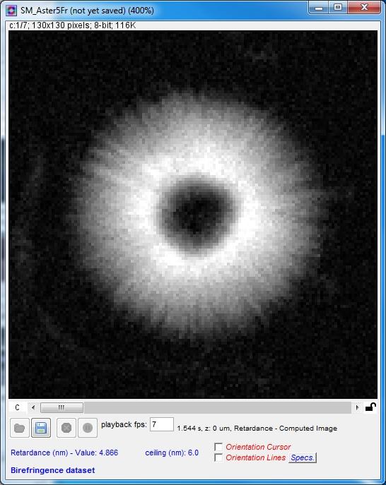 Retardance is typically measured as a distance in nm, signifying the relative distance between the two wavefronts that are associated with the two polarization components that pass through a birefringent material. The OpenPolScope measures the retardance for every resolved specimen point and presents the results of the computation as the retardance image.