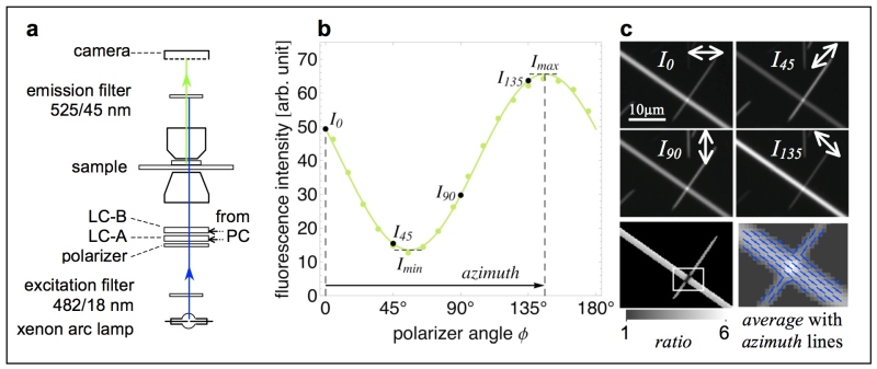 The OpenPolScope software synchronizes the LC or filter wheel settings and image acquisitions, calculates the fluorescence, anisotropy, and polarization orientation for each resolved image point, and presents the results as images.